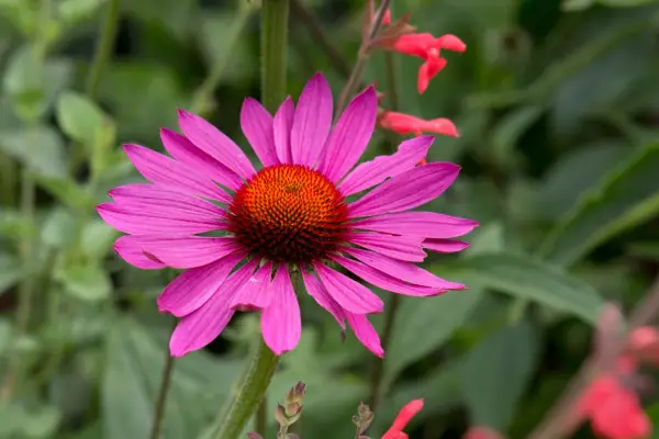 Echinacea purpurea 'Magnus' bærer store, dype rosa tusenfrydlignende blomster med et mørkt oransje senter, holdt horisontalt på stive stengler. Den har en lang blomstringssesong og er ekstremt attraktiv for bier og sommerfugler.